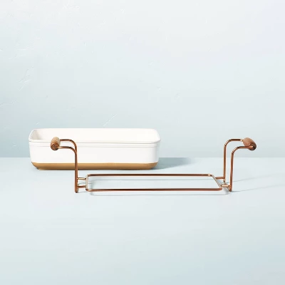 This Oven-to-Table Stoneware Baking Dish with Cradle Carrier from Hearth & Hand™ with Magnolia makes entertaining friends and family simply beautiful. Bake your favorite casserole in this oven-safe rectangular dish and then simply place it in the cradle carrier to display and serve. The wooden handles make for easy carrying from oven to table. The two-tone baking dish is crafted from timeless stoneware for a decorative and functional essential you’ll want to keep in your kitchen for years to come.